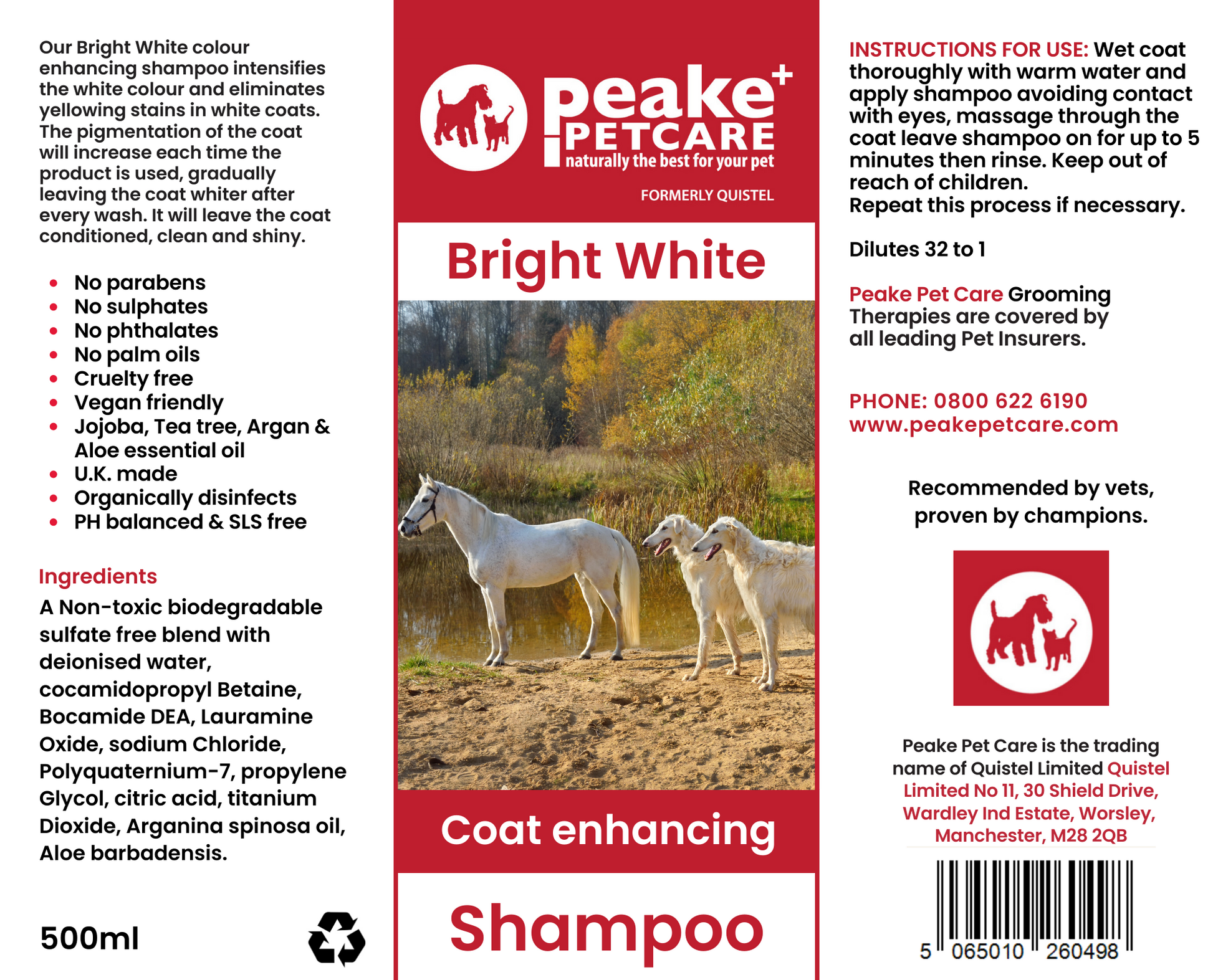 For Trade Customers: Our Bright White colour enhancing shampoo intensifies the white colour and eliminates yellowing stains in white coats. The pigmentation of the coat will increase each time the product is used, gradually leaving the coat whiter after every wash. It will leave the coat conditioned, clean and shiny.